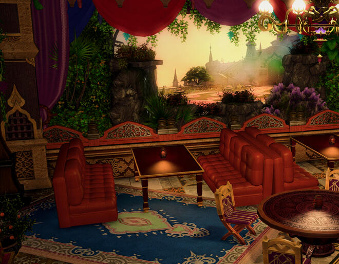 Greetings and salutations from The Magus' Respite! We seek to bring to you the finest Thavnairian drinks and cuisine, along with the bright colours, smells, and personalities our home is known for! All of our meals are prepared fresh, and the drinks prepared with ales and spirits expertly brewed by Alchemists from the High Crucible of Al-Kimya!If you are a performer, be it a bard, dancer, fortune teller, or anything else please feel free to make use of our stage and space! We would be grateful to have you share your craft with us!Feel free to sit back, relax, and enjoy your time among friends, family, and the soothing gardens inspired by my time at Radz-at-Han!